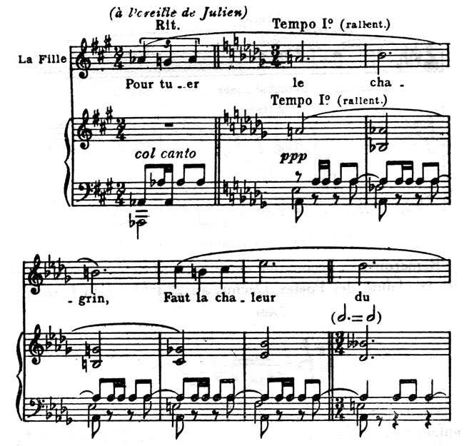 (*) D'après Carl Engel, Directeur de la Section de Musique à la Bibliothèque du gouvernement de Washington, M. Henry F. Gilbert, gardien de bestiaux à bord des paquebots, venu à Paris en 1901, assista à une représentation de Louise. Il en reçut une telle impression que, de retour en Amérique, il abandonna sa carrière, travailla la composition et devint un compositeur renommé aux Etats-Unis.