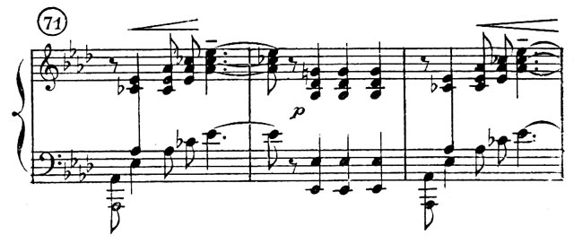 Et tout à coup, sur un roulement des timbales, sur une tenue des cors, prolongée par les violoncelles et les contrebasses, vibre, sinistre, une note de tamtam, pendant que les pizzicati des cordes marquent comme les derniers battements du cœur :
