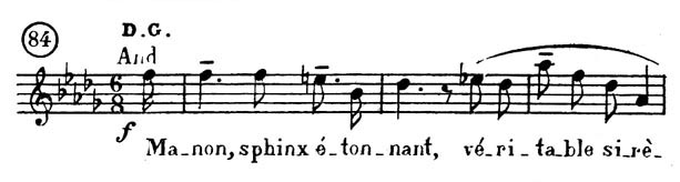 affirmant encore son énergie par le rythme et les forte qui couperont les lamentations de Lescaut. Dans toute cette partie, presque entièrement écrite en récitatifs, se détache une seule phrase mélodique, dont la montée traduit' l'exaltation de des Grieux, à la pensée de retrouver Manon ; en même temps, la mélodie chante à l'orchestre, et les clarinettes, dans un mouvement ralenti, reprennent comme en écho une partie de la phrase de des Grieux :