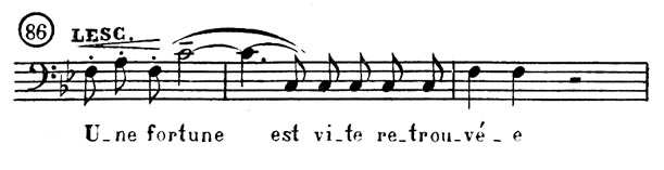 Un pareil rappel ne semble pas fortuit, non plus d'ailleurs que le dessin d'orchestre qui, sur une gamme des basses, accompagne la querelle de des Grieux et de Guillot : ce rythme, en effet, traduisait dans le quatuor du second acte la dispute entre Lescaut et le chevalier (cf. partition, page 146). Sur la menace qui gronde sourdement dans les trilles très lents des contrebasses et des violoncelles :