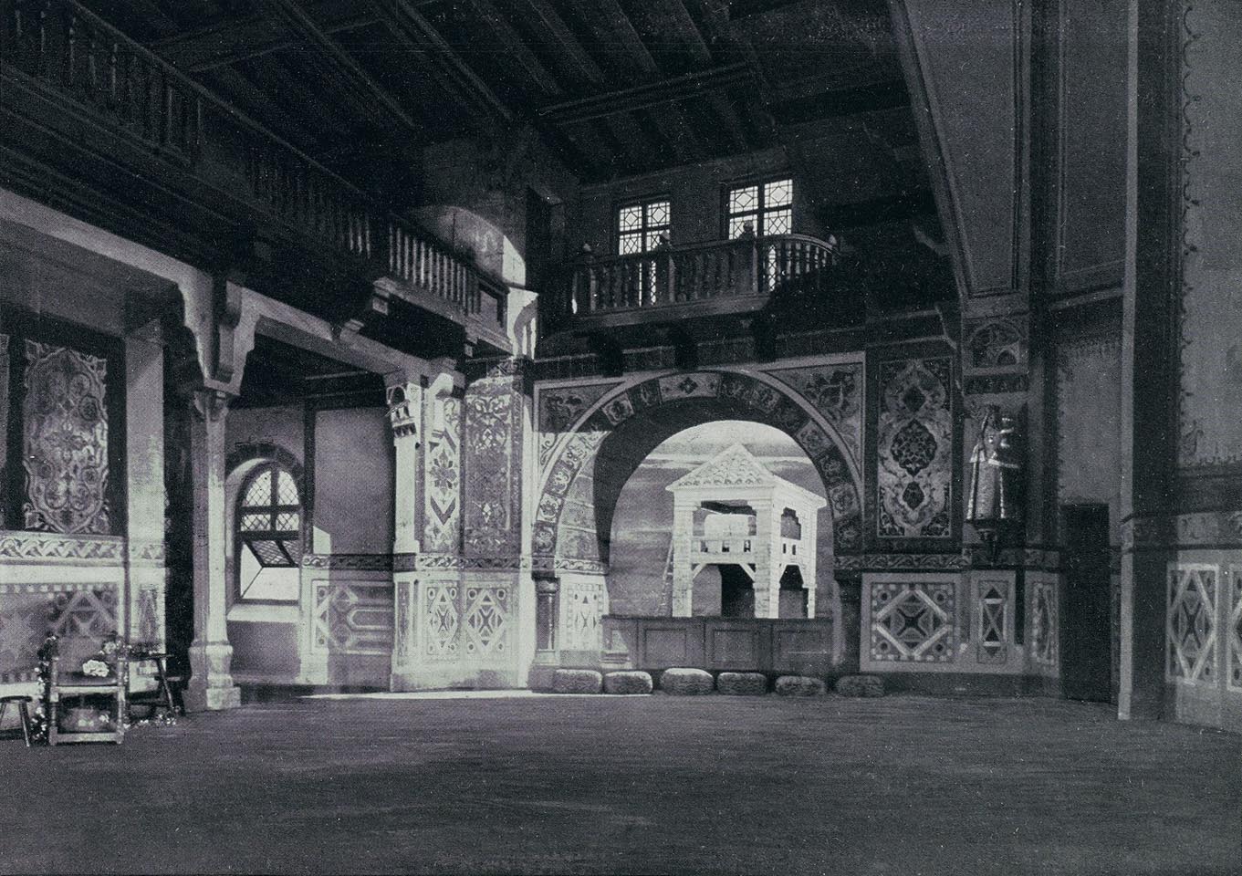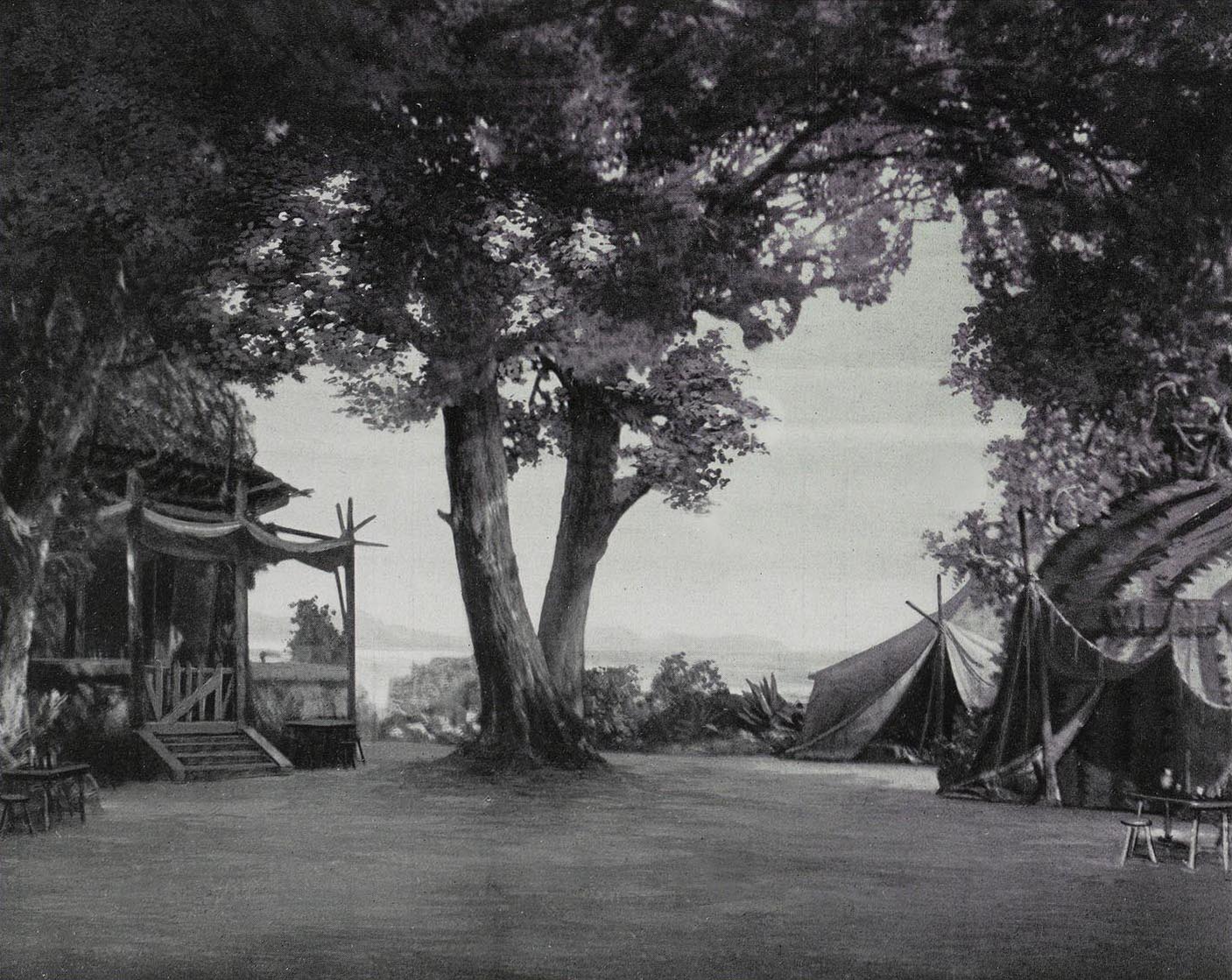 Après celle du Cobzar, la musique des Deux Pigeons a paru également juste, vive, aimable et fine. Dirigée par M. Paul Vidal, elle a trouvé sur la scène d'admirables interprètes : Mlle Zambelli (à gauche) tendre et malicieuse, Mlle Aïda Boni (à droite) souple et séduisante, Mlle Meunier, M. Aveline. Les décors, par leur richesse de couleurs, rappellent un peu ceux du Cobzar. Nous donnons ici la photographie de celui du premier acte. (Musica, mai 1912)