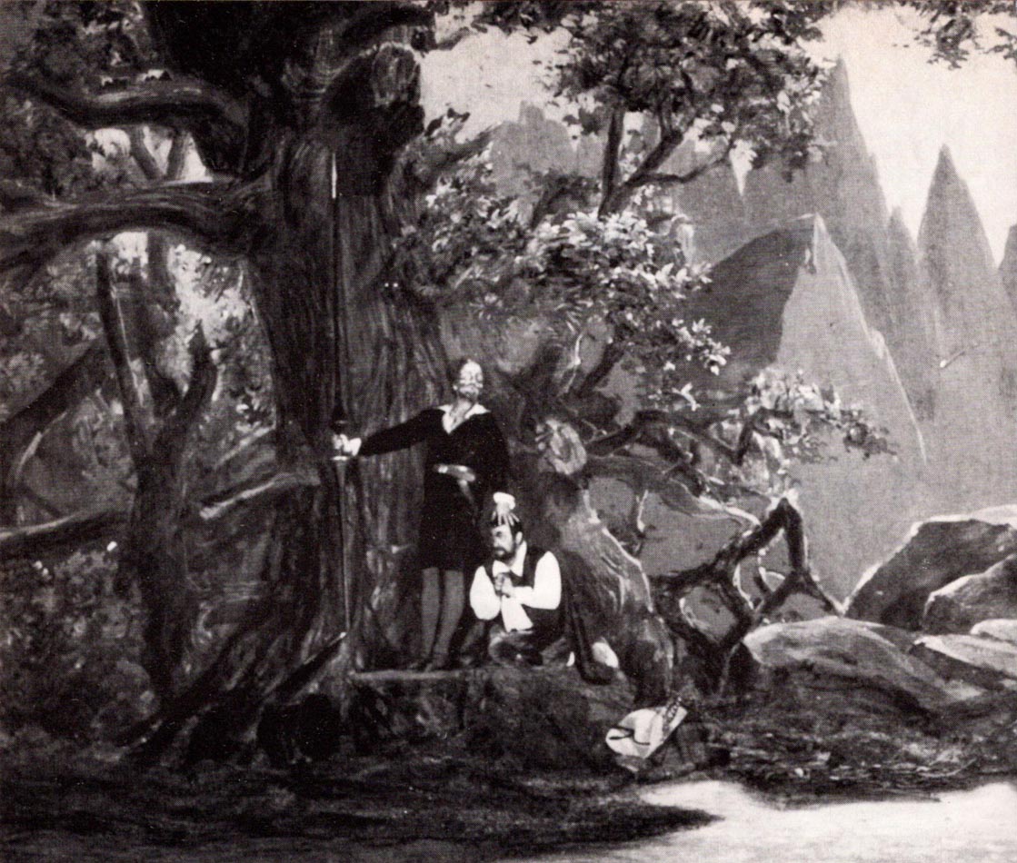 (Don Quichotte repose, debout, contre un grand chêne. Sancho le veille comme un enfant, il attise un feu de sarments qui réchauffera son « grand ». Il retirera silencieusement sa grosse veste pour en couvrir les pieds du pauvre chevalier ; puis sa prière s'élèvera attendrie et fervente.)