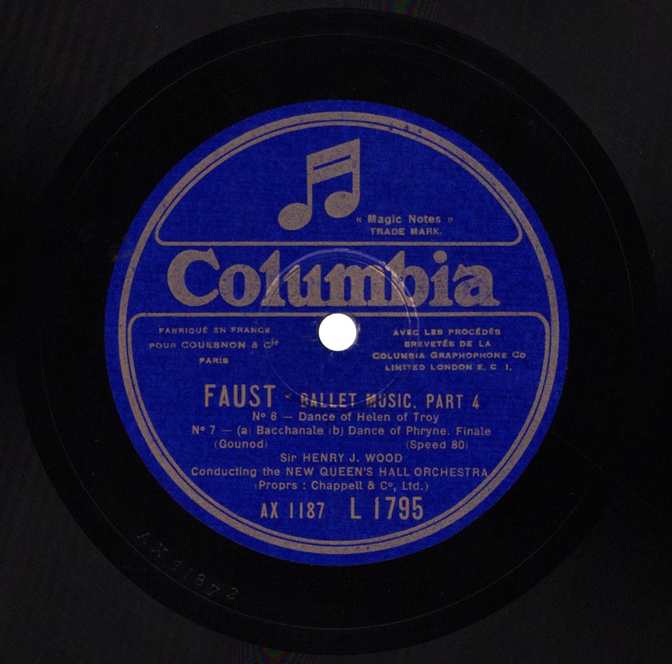 Ballet 1. les Nubiennes - 2. Adagio - 3. Danse Antique - 4. Variations de Cléopâtre - 5. les Troyennes - 6. Variations du Miroir - 7. Danse de Phryné Orchestre du New Queen's Hall dir Sir Henry J. Wood Columbia L 1794 et L 1795, mat. WAX 1184 à WAX 1187, enr. le 26 avril 1926