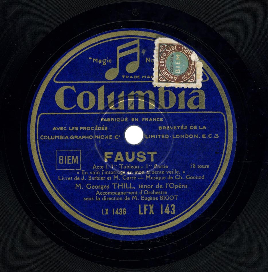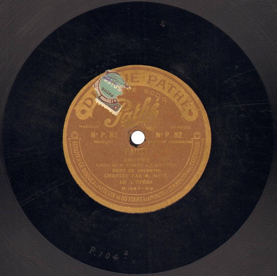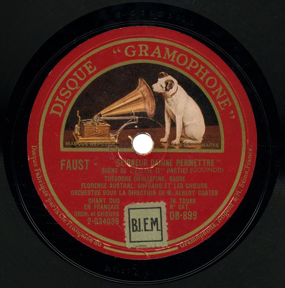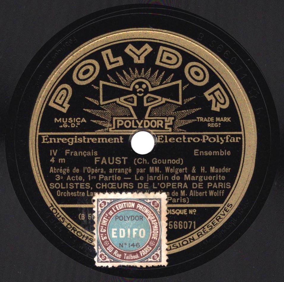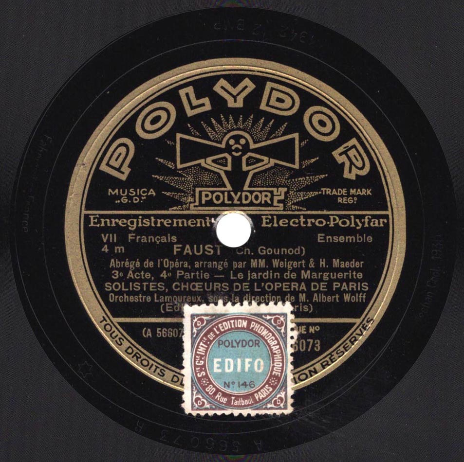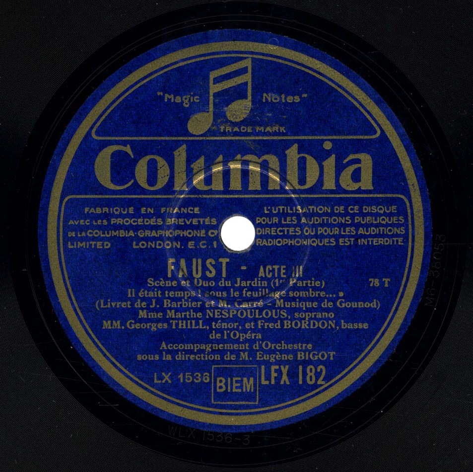 - Version intégrale 1930 : Marguerite : Mireille Berthon ; Siebel : Marthe Coiffier ; Dame Marthe : Jeanne Montfort ; Faust : César Vezzani ; Méphistophélès : Marcel Journet ; Valentin : Louis Musy ; Wagner : Michel Cozette ; Choeurs et Fanfare de l'Opéra ; Orchestre Symphonique dir. Henri Büsser ; Gramophone L.806 à L.825, enr. en 1930 => livret