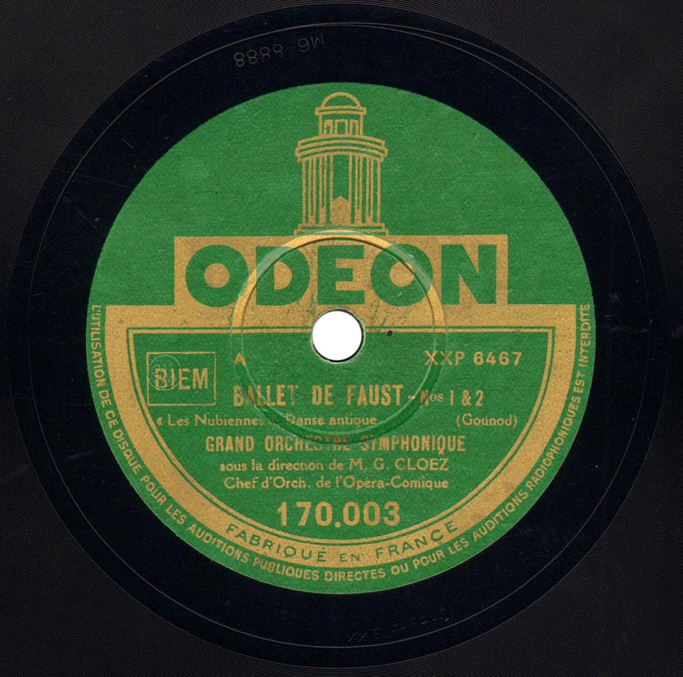 Ballet 1. les Nubiennes - 2. Adagio - 3. Danse Antique - 4. Variations de Cléopâtre - 5. les Troyennes - 6. Variations du Miroir - 7. Danse de Phryné Orchestre des Concerts Lamoureux dir Gustave Cloëz Odéon 170.003 et 170.004, mat. XXP 6467 à XXP 6470, enr. le 13 avril 1927