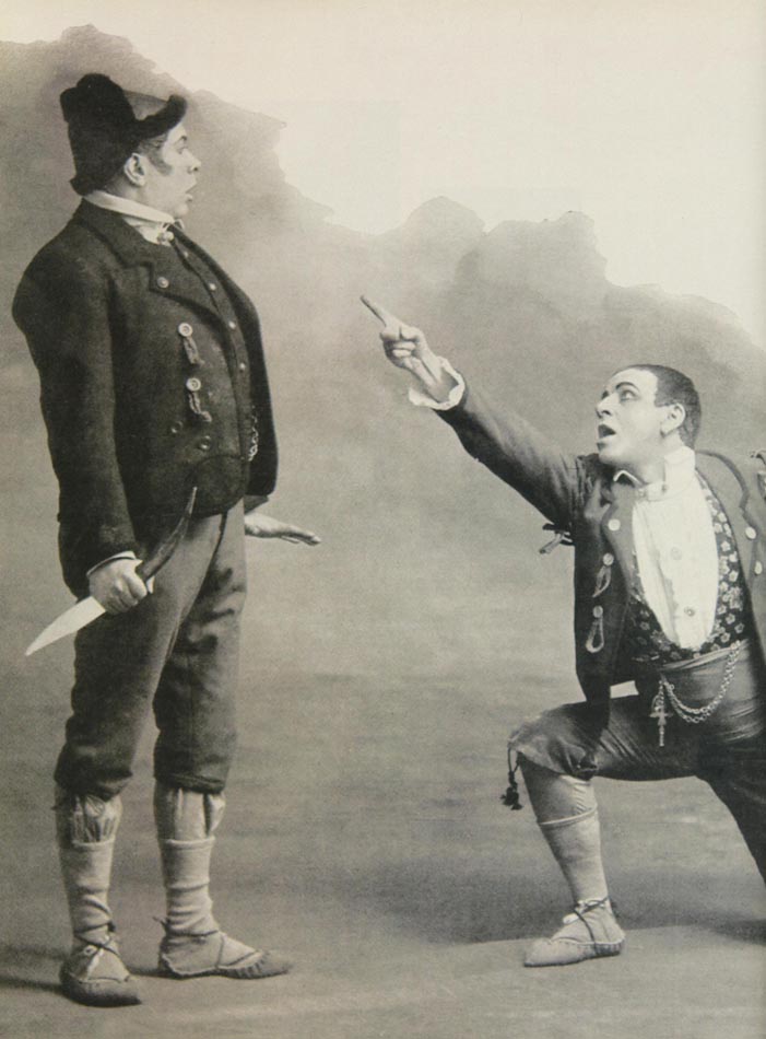 Acte I. « Romeria » (Fête). — Une grande salle dans un ancien palais. Scène 1. — Ramon, accoudé à une table, les yeux fiévreux, se sert de fréquentes rasades de vin. Quatre compères poursuivent une fille, puis interpellent Pilar qui répond du dehors avec entrain. Ils s'approchent de Ramon et lui donnent une bourrade. Ramon, excédé, s'échappe. Scène 2. — Ramon, seul, ferme violemment la fenêtre sur le grouillement turbulent de la rue et sanglote. Désolé du mariage de son frère Pedro avec Pilar, il songe à se suicider, puis laisse retomber la navaja. Pilar l'appelle du dehors. Ramon tressaille. Scène 3. — On entend passer une Rondalla (bande de musiciens). Pilar, en costume de mariée, entre joyeuse. Elle saute au cou de Ramon, tout en appelant Pedro. Ramon l'étreint farouchement jusqu'au moment où Pedro arrive. Scène 4. — Aux deux fiancés, Ramon tient des propos étranges. Dehors, la Rondalla repasse ; la foule crie « Habanera ! ». Pilar s'échappe. Pedro s'élance derrière elle. Scène 5. — Ramon bondit pour arrêter son frère. Pedro le bouscule et l'envoie rouler contre la table. Ramon se redresse, la main armée de la navaja comme par le mauvais sort, et frappe Pedro entre les épaules. Pendant ce temps, Pilar continue à appeler Pedro et la foule crie toujours : « Habanera ! ». Ramon sort par la porte basse. Scène 6. — Pilar entre et s'élance vers Pedro, dont elle embrasse le cadavre avec égarement. La foule envahit la salle. Scène 7. — Deux hommes arrivent avec Ramon. Le Vieux, père de Pedro et de Ramon intime à ce dernier l'ordre de poursuivre sans trêve l'assassin de Pedro. Ramon, hébété, presque absent, le jure.