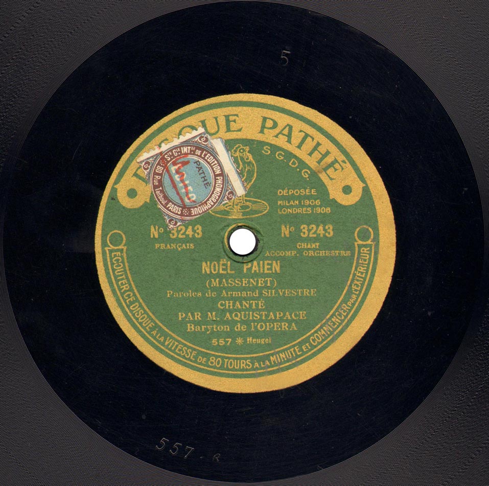 Noël païen Jean Aquistapace, basse, avec Orchestre Pathé saphir 80 tours n° 3243, mat. 557, enr. en 1924