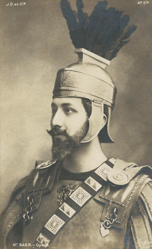 Sorti du lycée de Lille avec son diplôme de bachelier, M. Baër dut aller contre la volonté paternelle pour suivre son irrésistible penchant pour le théâtre. Après ses études au Conservatoire de Paris (classe Duvernoy), il fut engagé à l'Opéra, où il débuta dans Faust. Il chanta ensuite Roméo et Juliette, Rigoletto, Thaïs, Paillasse, Henri VIII, puis au Casino de Monte-Carlo aux côtés de Caruso et de Mme Calvé. A la Gaîté-Lyrique, M. Baër reprit le rôle de Chilon dans Quo Vadis ? A Rouen, il fit des créations telles que : le Chemineau, Grisélidis, Méphistophélès de Boito et Don Quichotte de Massenet. Au Grand-Théâtre de cette dernière ville, où il se trouvait engagé pour la saison 1912-1913, M. Baër a créé : Monna Vanna, la Terre qui meurt, les Trois Masques et la Sorcière. (Henri Focké, Célébrités de l’art lyrique, 1914)