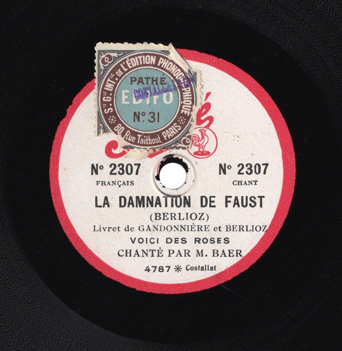 "Voici des roses" extrait de la 2e partie de la Damnation de Faust de Berlioz Fernand Baër (Méphistophélès) et Orchestre Pathé saphir 90 tours n° 4787, réédité sur 80 tours n° 2307, enr. en 1907