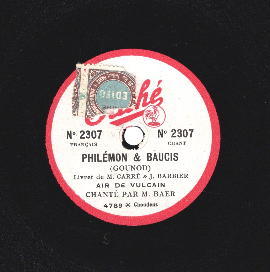 Au bruit des lourds marteaux extrait de l'acte I de Philémon et Baucis de Gounod Fernand Baër (Vulcain) et Orchestre Pathé saphir 90 tours n° 4789, réédité sur 80 tours n° 2307, enr. en 1907