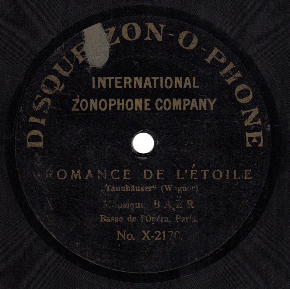 Romance de l'Etoile extrait de l'acte III de Tannhäuser de Wagner [v. fr. de Charles Nuitter] Fernand Baër (Wolfram) et Piano Zonophone X 2170, enr. à Paris vers 1903