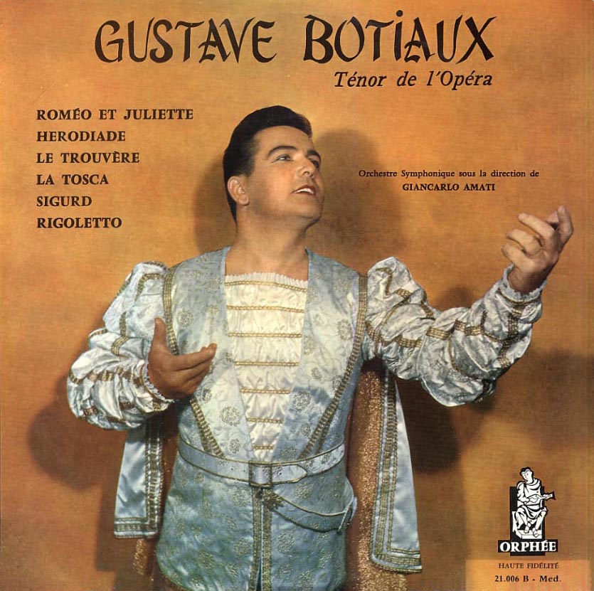 Gustave Botiaux s'impose comme l'un des chanteurs les plus doués de la jeune génération : l'oiseau rare, un ténor de vaillance ; mais séduisant, discipliné, sans emphase. En quelques saisons, il vient de gravir les échelons de la notoriété. Premier Prix de chant du Conservatoire de Paris, Premier au concours de ténors de Cannes, Grand Prix au concours international de Bruxelles, il était immédiatement engagé, il y a quatre ans, au Théâtre de la Monnaie, où il était affiché dans Samson et Dalila et Madame Butterfly. Cependant Paris le réclamait. Après Bruxelles, il paraissait à l'Opéra dans le Chevalier à la rose et, à l'Opéra-Comique, dans Cavalleria rusticana. A ce dernier théâtre, il triomphait également dans la Tosca, et les habitués de la Salle Favart se rappelleront ce soir d'Octobre 1959 où, à l'occasion de la reprise de Roméo et Juliette, son interprétation de la Cavatine déchaînait d'interminables ovations, alors que son contre-ut, à l'issue de l'acte des duels, était suivi par dix-sept rappels d'une assistance qui retrouvait avec délectation les grandes soirées des Kiepura, Lugo, Thill, Villabella, Luccioni. Avec son sourire sympathique et son rire étincelant, le nouvel élu apporte un vivant démenti aux adeptes du chant confidentiel et du civet sans lièvre. Sa quinte aiguë, ronde, moelleuse, et pourtant vibrante et péremptoire, couronne un médium déjà consistant, et le prédestine à l'héritage des Escalaïs, Duc, et autres Vezzani. Il est le heldentenor que l'on attendait pour Guillaume Tell, la Juive, les Huguenots. Les autres villes de France ont ratifié l'enthousiasme de Paris dans Aïda, Carmen, Faust, Hérodiade, Lohengrin, Rigoletto, la Bohème, Sigurd. L'étranger le sollicite. Un nouvel astre est né à ce ciel du bel canto dont la popularité recrudescente incite actuellement une foule de plus en plus dense à tendre vers lui l'objectif de ses lorgnettes et le radar de ses électrophones. (Guy Dumazert, 1960)