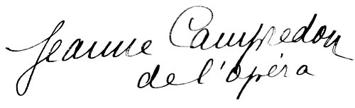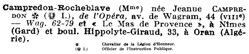 Mlle Jeanne Campredon, née à Djidjelli (département de Constantine), commença ses études de piano dès l'âge de sept ans, puis plus tard celles du chant, à Alger. Après avoir auditionné chez Mme Rosine Laborde, chez Isnardon et Bouvet, elle devint l'élève de ce dernier. Après huit mois d'études, entra en 1907 à l'Opéra, où elle débuta le 13 mars, dans le rôle de la Reine de Navarre, puis chanta Ophélie et tout le répertoire. Mlle Campredon s'est fait entendre à Nice, Genève, Lyon, Aix-les-Bains, Nantes, Anvers, etc., villes où elle retourne chaque année, a chanté le répertoire classique dans les grands concerts et tout dernièrement interpréta, au Trocadéro, sous la direction de Weingartner, la Messe en ré de Beethoven. Elle joua à Stockholm, devant les souverains suédois : Faust, Roméo et Juliette et la Vie de bohème. Créations : Junia dans Roma à l'Opéra, Freia dans l'Or du Rhin, une Fille du Rhin dans le Crépuscule des Dieux, et la Forêt. A repris Gwendoline après Mlle Kousnezoff, sur la demande de M. André Chabrier. (Henri Focké, Célébrités de l’art lyrique, 1914)