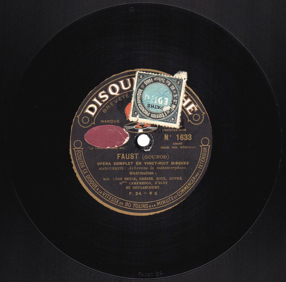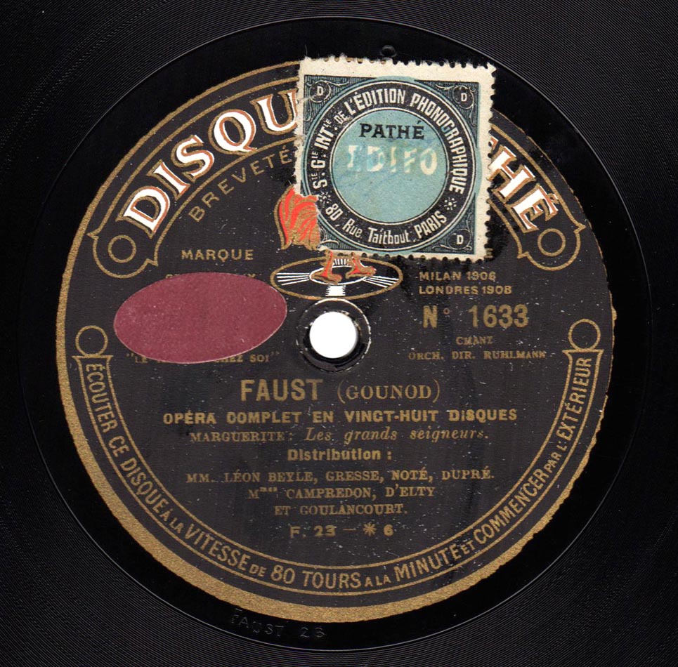 Air des Bijoux extrait de l'intégrale de Faust de Gounod de 1912 Jeanne Campredon (Marguerite) et Orchestre de l'Opéra dir François Rühlmann Pathé saphir 90 tours mat. F.23 et F.24, réédités sur 80 tours n° 1633, enr. en 1911/1912