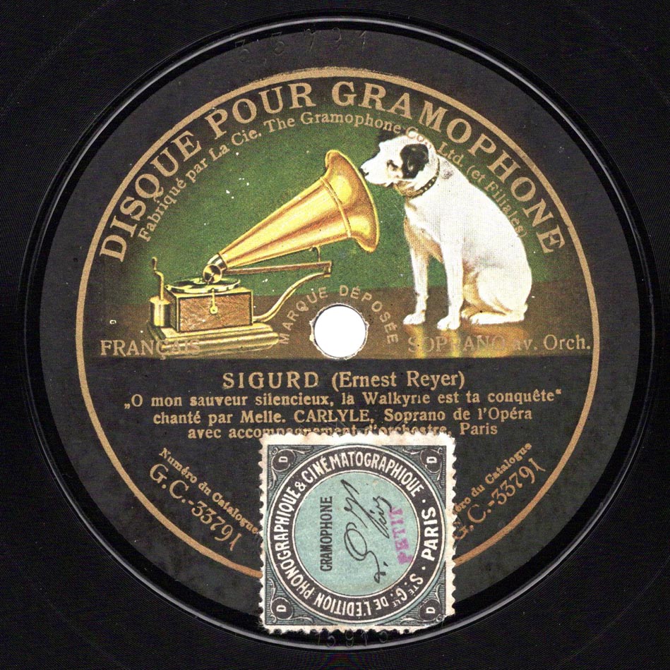 "Salut, splendeur du jour... Ô mon sauveur silencieux" extraits de l'acte III de Sigurd de Reyer Odette Carlyle (Brunehilde) et Orchestre Disque Pour Gramophone 33764, mat. 15866u, et 33791, mat. 15915u, enr à Paris les 15 et 17 juin 1910