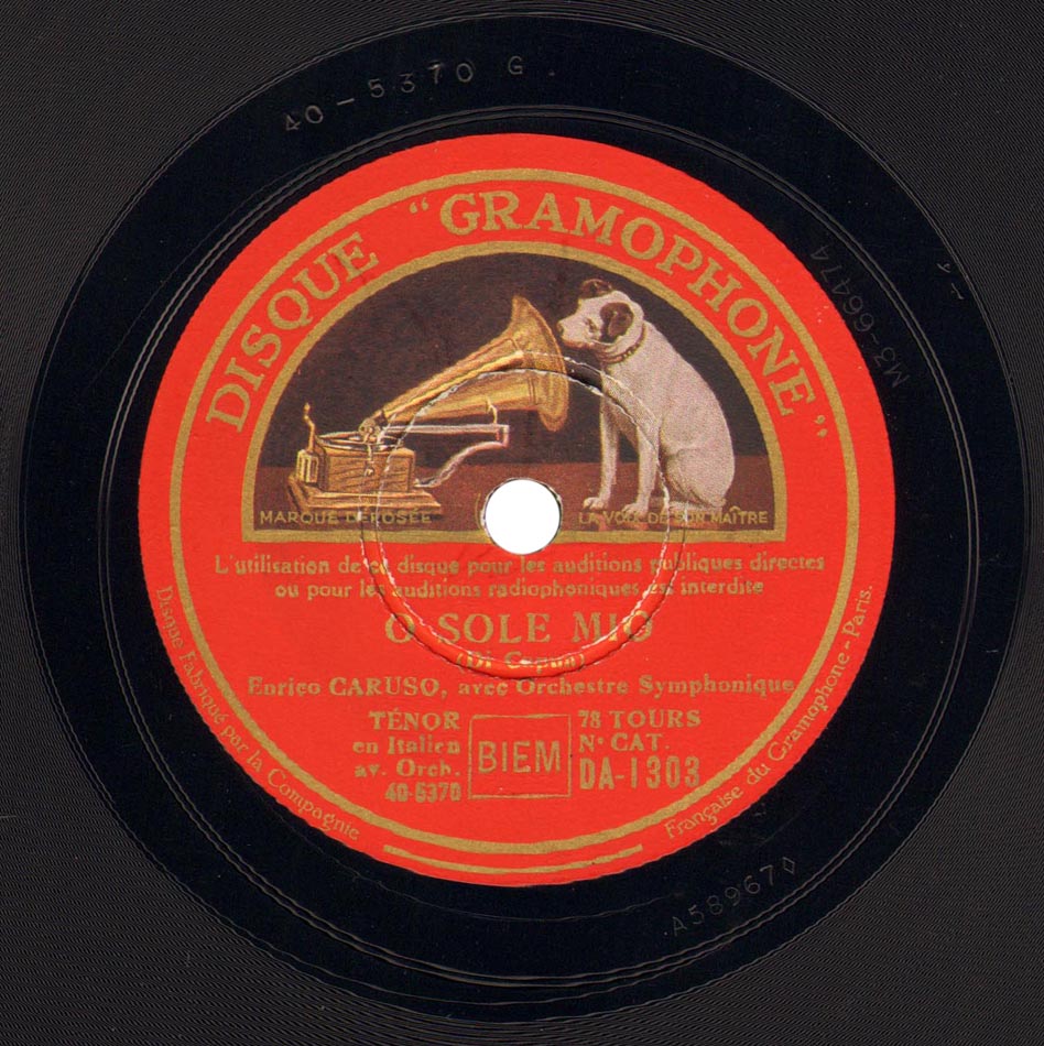'O sole mio (par. Giovanni Capurro / mus. Eduardo Di Capua) Enrico Caruso et Orchestre dir. Walter B. Rogers Victor 87243, mat. B-17124, enr. à Camden, New Jersey, le 05 février 1916 (a) réenregistré à Camden le 15 août 1932 avec le Victor Symphony Orchestra dirigé par Nathaniel Shilkret sur Gramophone DA 1303, mat. 40 5370 (b)