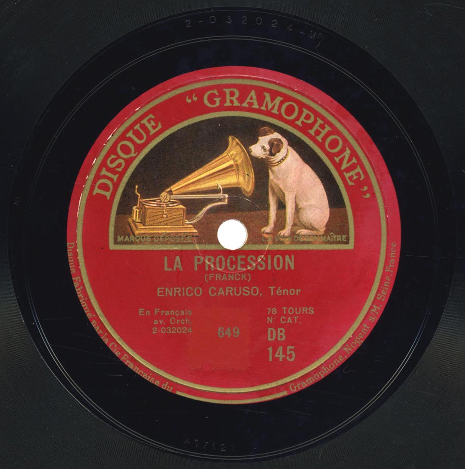 la Procession (par. Auguste Brizeux / mus. César Franck) Enrico Caruso, Francis J. Lapitino (harpe) et Orchestre dir. Walter B. Rogers Victor 88556, mat. C-17121, réédité sur Gramophone DB 145, mat. 2-32024, enr. à Camden, New Jersey, le 05 février 1916
