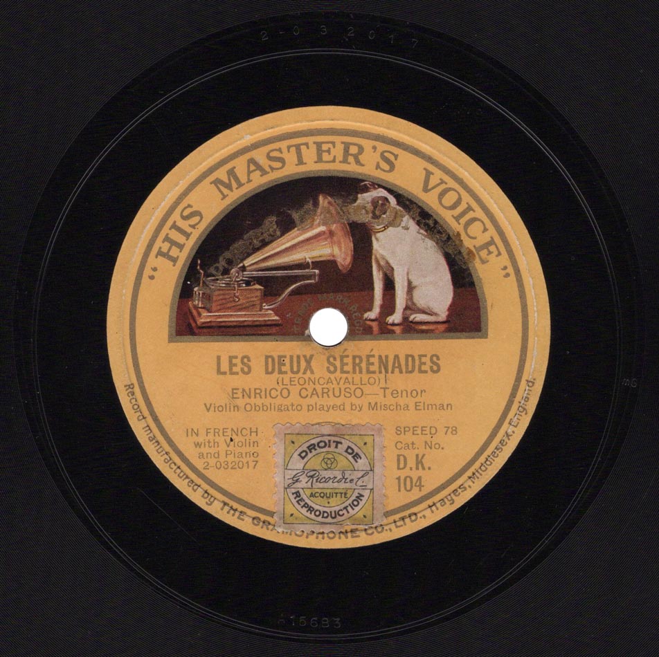 Sérénade française extrait des Deux Sérénades (par. Enrico Collet / mus. Ruggero Leoncavallo) Enrico Caruso, Mischa Elman (violon) et Gaetano Scognamiglio (piano) Victor 89085, mat. C-15683, réédité sur Gramophone DK 104, mat. 2-032017, enr. à New York le 06 février 1915