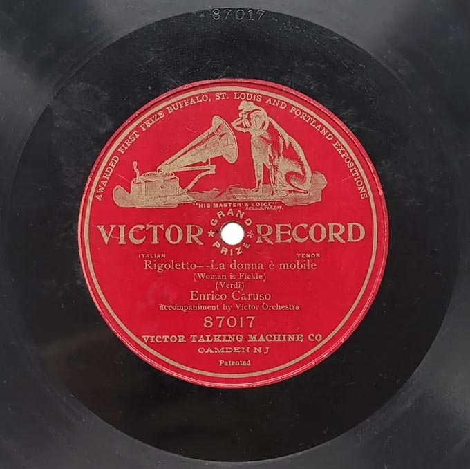 "La donna è mobile" extrait de l'acte III de Rigoletto de Verdi Enrico Caruso (le Duc de Mantoue) et Orchestre Victor 87017, mat. B-6033, enr. à Camden, New Jersey, le 16 mars 1908 (a) réenregistré à Camden le 03 décembre 1932 avec le Victor Symphony Orchestra dirigé par Nathaniel Shilkret sur Gramophone DA 1303, mat. 40 5506 (b)