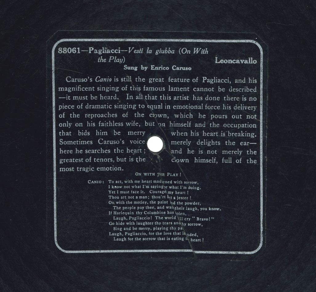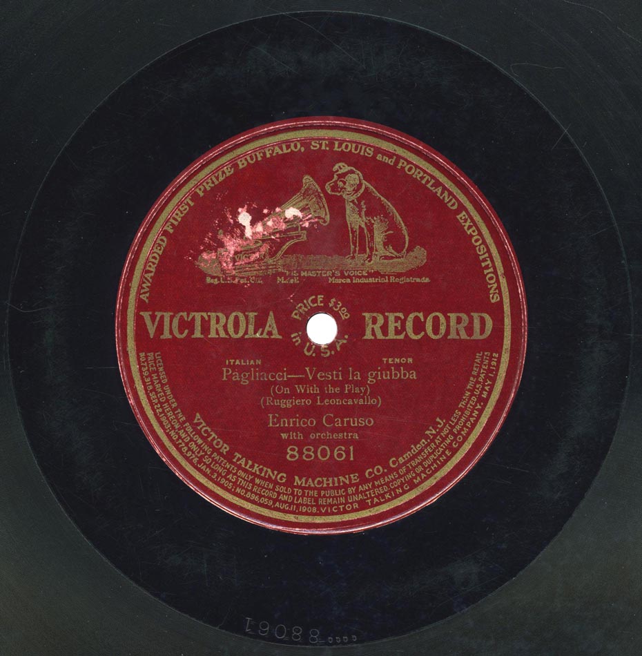 "Vesti la giubba" extrait de l'acte I d'I Pagliacci de Leoncavallo Enrico Caruso (Canio) et Orchestre Victor 88061, mat. C-4317, enr. à New York le 17 mars 1907 (a) réenregistré à Camden, New Jersey, le 15 août 1932 avec le Victor Symphony Orchestra dirigé par Nathaniel Shilkret sur Gramophone DB 1802, mat. 42 1328 (b)