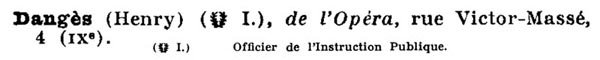 M. Henry Dangès, premier baryton d'opéra, est né à Lyon, où il commença ses études musicales au conservatoire avec Jourdan-Savigny et Alexandre Luigini, qui devint le réputé chef d'orchestre de l'Opéra-Comique. Il compléta ses études de chant à Paris avec le baryton Jacques Bouhy. Après un court séjour à l'Opéra-Comique, où il chanta Carmen, Manon, Philémon et Baucis, Louise, etc., il passa à la Gaîté-Lyrique, où il fit la reprise de Zampa et du Songe d'une nuit d'été, qui se jouèrent une trentaine de fois ; il créa, à ce théâtre, le rôle de Marat dans Charlotte Corday, d'Alexandre Georges. Il fit ensuite maintes créations à l'Opéra de Nice, à la Monnaie de Bruxelles, au Caire, à Lyon, Marseille, etc. M. Henry Dangès est à l'Opéra depuis six ans et y chante tous les grands rôles du répertoire français et wagnérien : Thaïs, Tannhäuser, Tristan et Isolde, Lohengrin, Rigoletto, Hamlet, la Damnation de Faust, Sigurd, etc. ; y créa le Miracle, Sibéria, Déjanire qu'il avait créée à Monte-Carlo où il interpréta la Tosca en italien, les Contes d'Hoffmann, les Noces de Figaro, Salammbô, etc. Depuis plusieurs années, M. Dangès donne régulièrement une série de représentations au Grand-Cercle d'Aix-les-Bains. A créé tout dernièrement le rôle d'Eurymaque dans Pénélope, au Théâtre des Champs-Elysées.