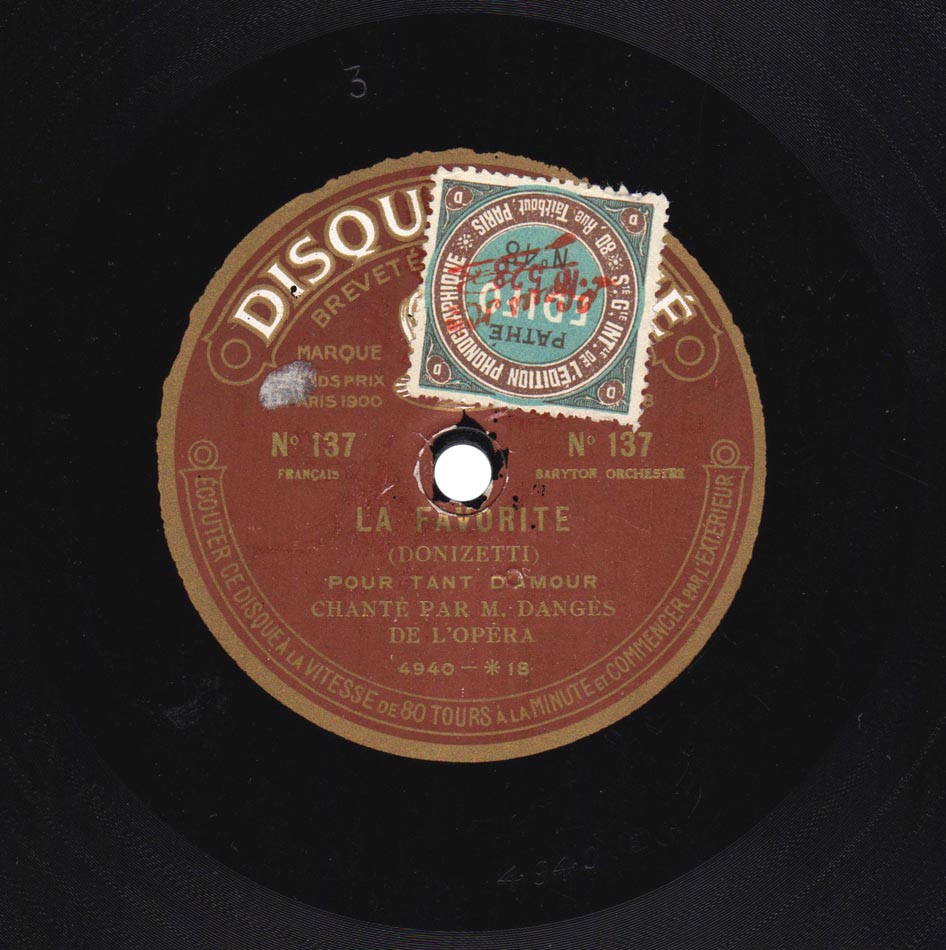 "Pour tant d'amour" extrait de l'acte II de la Favorite de Donizetti Henri Dangès (Alphonse XI) et Orchestre Pathé saphir 90 tours n° 4940 réédité sur 80 tours n° 137, enr. en 1908 |