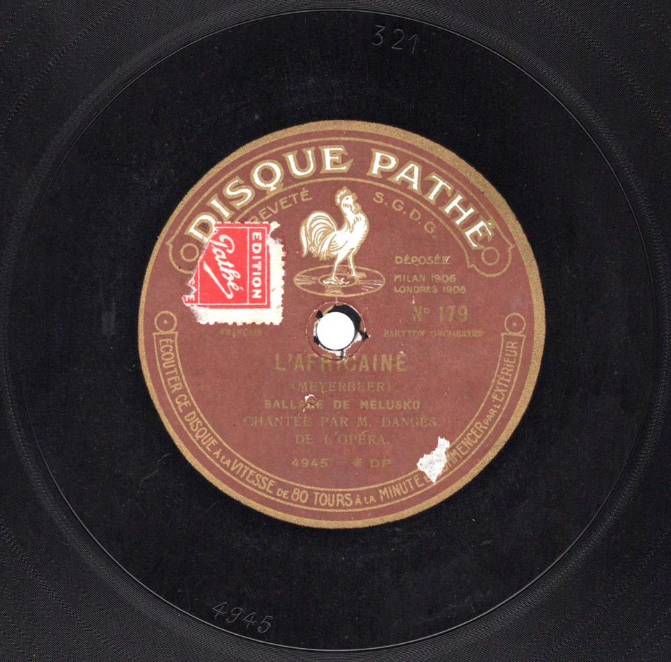 Air "Fille des rois" extrait de l'acte II de l'Africaine de Meyerbeer Henri Dangès (Nélusko) et Orchestre Pathé saphir 90 tours n° 4938, réédité sur 80 tours n° 179, enr. en 1908