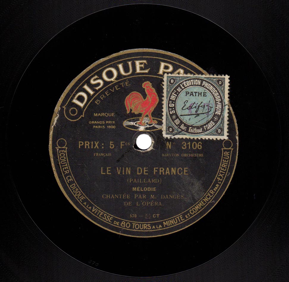 le Vin de France mélodie (par. S. & F. Borel / mus. Léon Paliard) Henri Dangès et Orchestre Pathé saphir 90t n° 570 réédité sur 80 tours n° 3106, enr. en 1908 |
