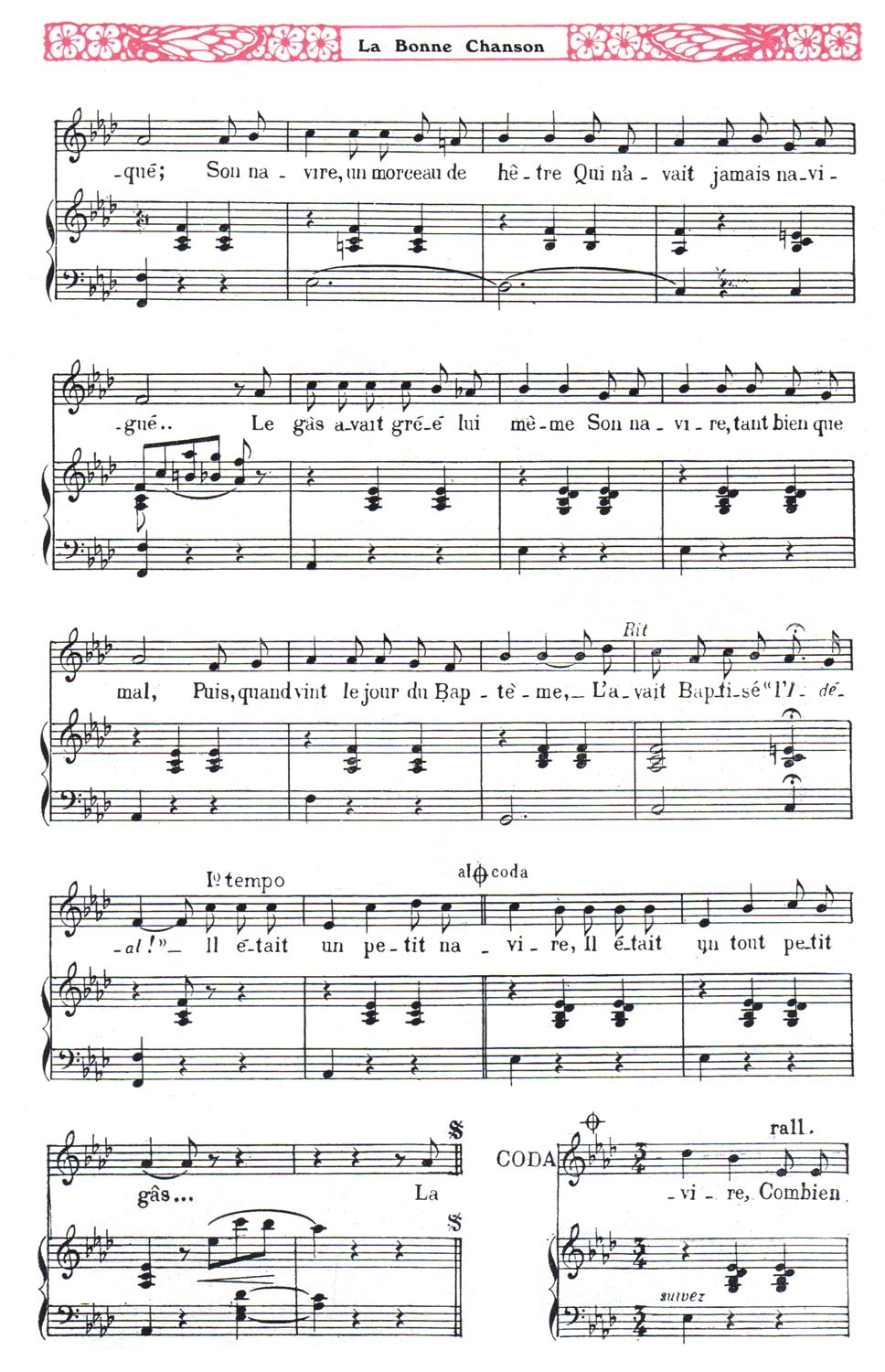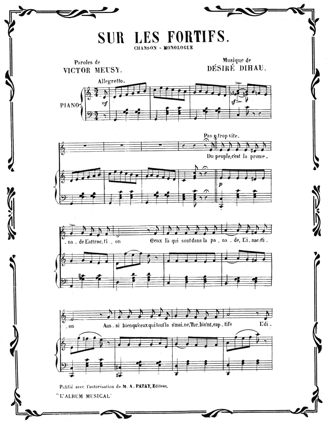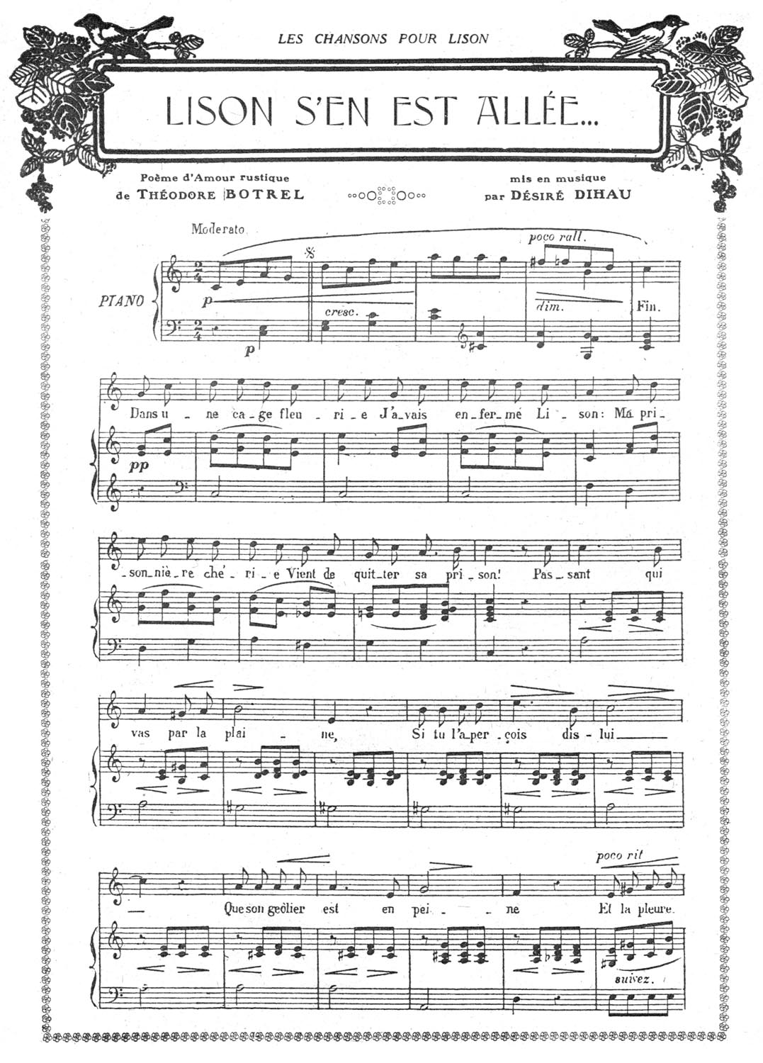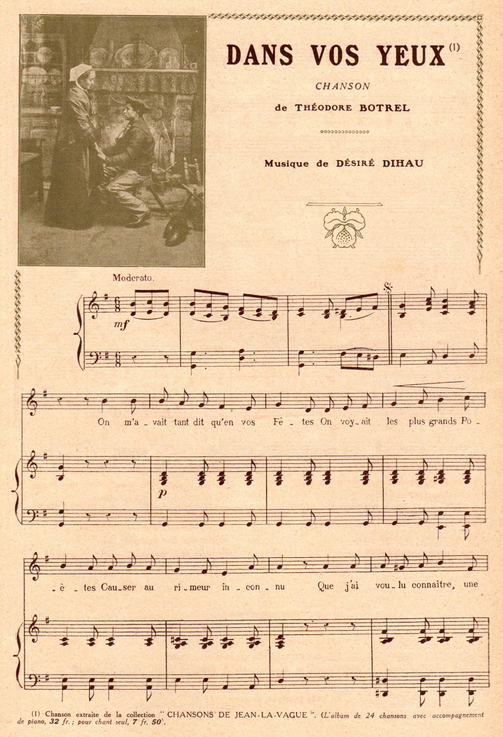 A la godille, chanson Achetez mes belles violettes, chanson, poésie de Jean Richepin (1886) => partition, illustration de Toulouse-Lautrec Adieu, barcarolle, poésie de Jean Richepin (1886) => partition, illustration de Toulouse-Lautrec Amants sont fidèles (les), chansonnettes, paroles de Jeanne Joly (1893) => partition Au jardin de mon cœur, mélodie, poésie de Jean Richepin (1898) => partition Au pied du mur, monologue, paroles d’Arkanciel (1894) => partition Ballade de Noël, ballade, poésie de Jean Richepin (1888) => partition, illustration de Toulouse-Lautrec Bavardage, poésie de George Auriol [partition ci-dessous] Berceuse, berceuse, poésie de Jean Richepin (1886) => partition, illustration de Toulouse-Lautrec Bonheur manqué, chanson, poésie de Théodore Botrel [partition ci-dessous] Ça ne vaut pas la tour Eiffel, chansonnette comique, paroles de Richard O’Monroy (1900) => partition Carmencita, chansonnette Ce qu’on mange à Paris, chanson, paroles de Victor Meusy [partition ci-dessous] Ce que dit la pluie, chanson, poésie de Jean Richepin => illustration de Toulouse-Lautrec Chanson de jeune fille, paroles d’Emile Dupont (1861) => partition Chanson du froment (la), chanson, poème d’Eugène Lemercier [partition ci-dessous] Chanson du vieux soldat de bois, paroles de George Auriol => partition avec illustration de George Auriol Chansons pour Lison (les), 15 poèmes d’amour rustique, poésies de Théodore Botrel : Hisse la grand’ voile !... ; Lison s’en est allée… ; Soir d’été, rondeau ; Tous deux !... ; Lison est revenue ! [partitions ci-dessous] Colombine à Pierrot, réponse, paroles de Gaston Habrekorn (1894) => partition illustrée par Toulouse-Lautrec Complainte du petit gâs breton, poésie de George Auriol [partition ci-dessous] D'où viens-tu ?, chanson, paroles de René Gry (1905) => partition illustrée par Charles Léandre Dans vos yeux, chanson, poésie de Théodore Botrel [partition ci-dessous] Deux roses (les), pavane, poésie d’Edmond Teulet [partition ci-dessous] Dites-moi pourquoi ?, chanson Don Alphonso, boléro Donne-moi tes lèvres en fleurs, chanson Douchinka, mazurka chantée En ramant !..., chanson de pêcheurs, poésie de Jean Richepin [partition ci-dessous] Etoiles filantes, mélodie, poésie de Jean Richepin (1890) => partition, illustration de Toulouse-Lautrec Femme de chagrin, berceuse, paroles de Léon Durocher (1893) => illustration de Toulouse-Lautrec Feu follet (le), valse chantée Floréal, grande valse, poésie de Jean Richepin (1886) => partition, illustration de Toulouse-Lautrec Fou (le), chanson, poésie de Jean Richepin (1886) => partition Gentil ruisseau, paroles de Raphaël Dufresne Graine de marins, chanson bretonne Hareng saur (l’), chanson, poésie de Jean Richepin (1886) => partition, illustration de Toulouse-Lautrec Hirondelles de mer (les), chanson, poésie de Jean Richepin (1886) => partition, illustration de Toulouse-Lautrec Il était un petit navire, chanson, poésie de Théodore Botrel [partition ci-dessous] Je confesse à Dieu Je pardonne, grande valse chantée Je vous aime, je t'aime, chanson Madame la Vierge !, chanson Marche des petits pâtissiers, chanson Midinettes (les), chanson Océano nox (Nuit en mer), cantilène, poésie de Jean Richepin (1886) => partition, illustration de Toulouse-Lautrec On demande un anarchiste, saynète, paroles d’Achille Mélandri et Victor Meusy (1892) => partition On sonne la retraite Papillons (les), ronde, poésie de Jean Richepin => illustration de Toulouse-Lautrec Part du feu (la), chansonnette Petit à petit, chanson, poésie de Théodore Botrel [partition ci-dessous] Petit enfant, mélodie ronde Petit trottin (le), paroles d’Achille Mélandri (1893) => partition, illustration de Toulouse-Lautrec Poupée Premier souvenir, mélodie Quand les lilas refleuriront…, mélodie, poésie de George Auriol (1890) => partition avec illustration de George Auriol Quatre fils Aymon (les), scène dramatique et burlesque, paroles d’Emile Dereux (1869) Que faut-il ?, rêverie, poésie de Léon Labarre (1873) => partition Quel coup de tampon !, chansonnette Rieuse au balcon (la), boléro, sérénade Rivière (la) Rois mages (les), légende, poésie de Lucien Delormel et P. Maly (1898) => partition, illustration de Toulouse-Lautrec Rossignol japonais, polka chantée Secret (le), mélodie, poésie de Jean Richepin (1886) => partition, illustration de Toulouse-Lautrec Sérénade à Colombine, chanson, paroles de Gaston Habrekorn [partition ci-dessous] Soirs (les), chanson Sous le charme, poésie de Pierre d’Amor (1909) => partition Sur les fortifs, chanson-monologue, paroles de Victor Meusy [partition ci-dessous] Vagues (les) Valse des lapins (la), paroles de Léon Durocher (1894) => partition, illustration de Toulouse-Lautrec Vieilles histoires (les), paroles de Jean Goudezki (1893) : 01. le Cœur du trouvère ; 02. Pour toi ! => partition ; 03. Fleurette ; 04. Nuit blanche => partition, illustration par Toulouse-Lautrec ; 05. Ta bouche… => partition ; 06. Souvenance ; 07. Habitude ; 08. Sagesse => partition ; 09. Ultime Ballade => partition illustrée par Toulouse-Lautrec ; 10. Comme la mouche… ; 11. Toujours ! ; 12. Doute ; 13. Repos ; 14. Ballade du pauvre imbécile ; 15. Pour oublier l’heure ; 16. Promenade ; 17. A côté du bonheur ; 18. Ex-voto ; 19. Ne parlons plus… ; 20. Cependant Viendra-t-il ?, chanson Vierge normande (la), chanson normande Vieux papillon (le), paroles d’Edmond Teulet [partition ci-dessous] Vieux papillons (les), menuet, poésie de Jean Richepin (1886) => partition, illustration de Toulouse-Lautrec Viv' la liberté , chansonnette Vœu d'une sœur (le), mélodie Voilà Pierre-qui-Roule !..., chanson, poésie de Théodore Botrel [partition ci-dessous] Voix de Béranger (la), chanson, paroles de V. Bellucci (1888) => partition