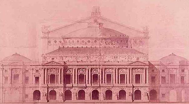 esquisse pour la façade de l'Opéra (premier projet), dessin exécuté entre 1860 et 1862 par Charles Garnier