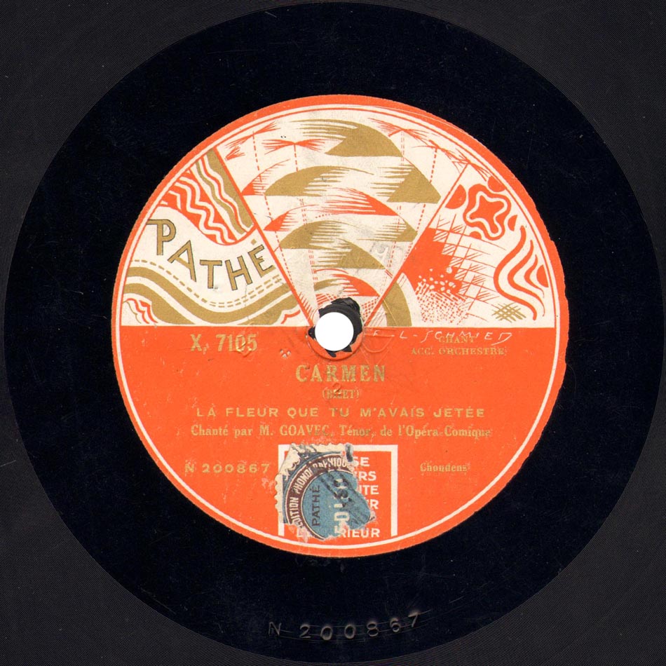 Air de la Fleur extrait de l'acte II de Carmen de Bizet André Goavec (Don José) et Orchestre Pathé X 7105, mat. N 200867, enr. le 26 octobre 1927