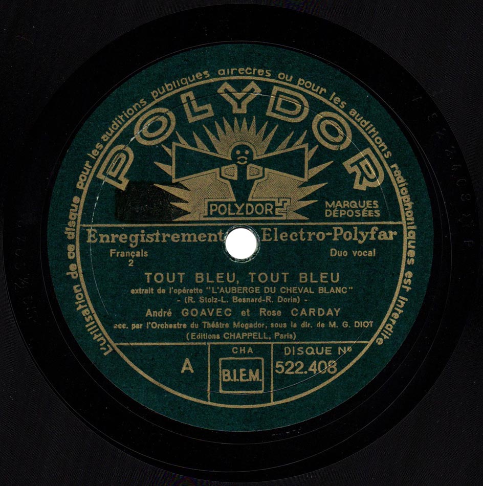 Duo "Tout bleu, tout bleu" extrait de l'Auberge du Cheval blanc de Stolz et Benatzky André Goavec, Rose Carday et Orchestre du Théâtre Mogador dir Gabriel Diot Polydor 522.408 A, enr. en 1932