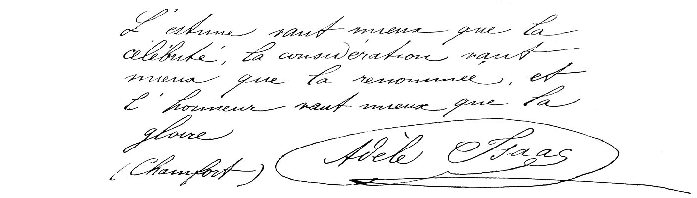 Telle est cette vie d'artiste si courte encore et si honorablement remplie par des succès inattaquables à la jalousie puisqu'ils sont tous le fruit et la récompense d'un travail qui ne s'est pas ralenti et non d'une réclame ou d'un engouement passagers. Aujourd'hui, comme à ses débuts, Mlle Adèle Isaac vit entre son père et sa mère, dans le modeste appartement de la rue de Maubeuge et je gage que les 70 ou 80,000 francs qu'elle va gagner par an ne la sépareront pas de ceux qu'elle aime. N'avais-je pas raison, en commençant, de vous dire que cette vie austère à la ville et si brillante à la scène était d'un salutaire enseignement ? Elle prouve d'une victorieuse façon cette vérité, trop souvent niée, que l'honnêteté est parfaitement compatible avec le vrai talent.