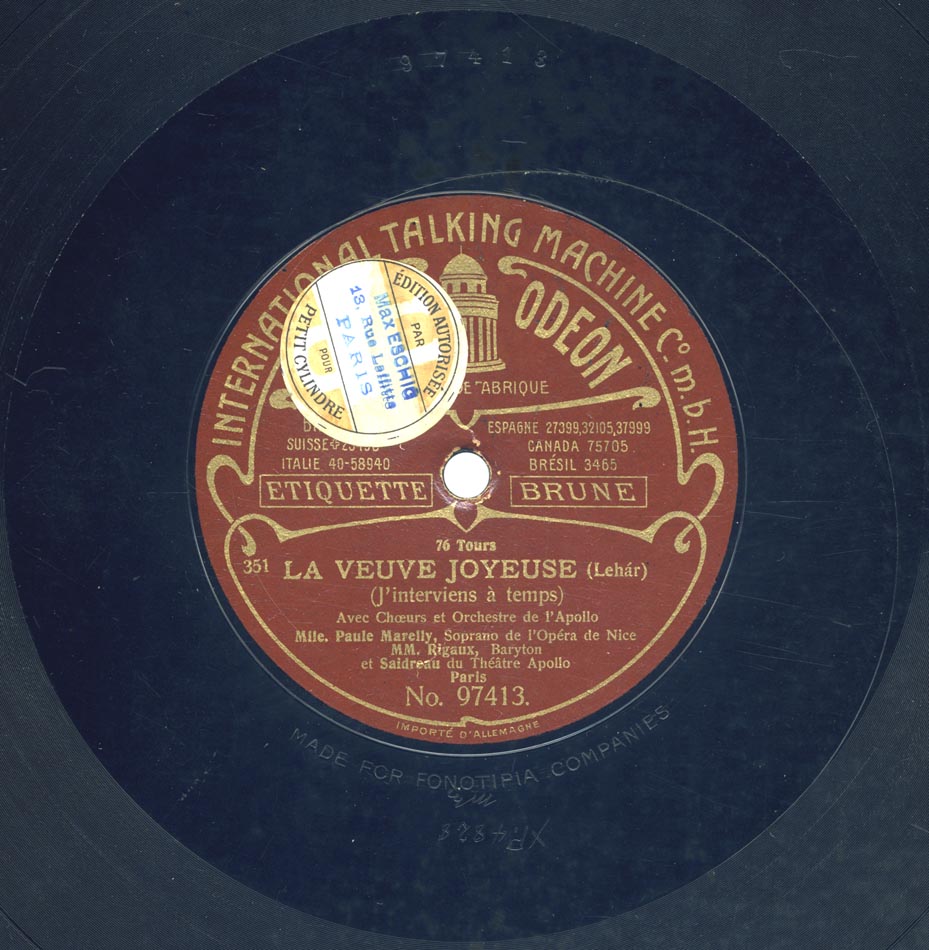 "J'interviens à temps" extrait de la Veuve joyeuse de Lehár [v. fr. de Flers et Caillavet] Paule Marelly, Rigaux, Saidreau, Choeurs et Orchestre de l'Apollo Odéon 97413, mat. XP 4828, enr. en mai 1909