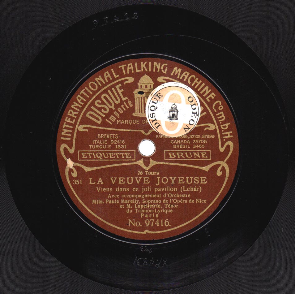 "Viens dans ce joli pavillon" extrait de la Veuve joyeuse de Lehár [v. fr. de Flers et Caillavet] Paule Marelly, René Lapelletrie et Orchestre Odéon 97416, mat. XP 4831, enr. en mai 1909