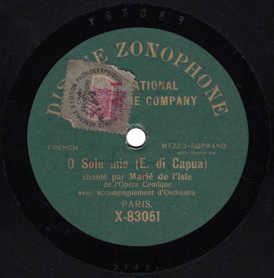 O sole mio (v. fr. A.-L. Hettich / mus. Eduardo di Capua) Jeanne Marié de l'Isle et Orchestre Zonophone X 83051, mat. 5145o, enr. à Paris en 1905