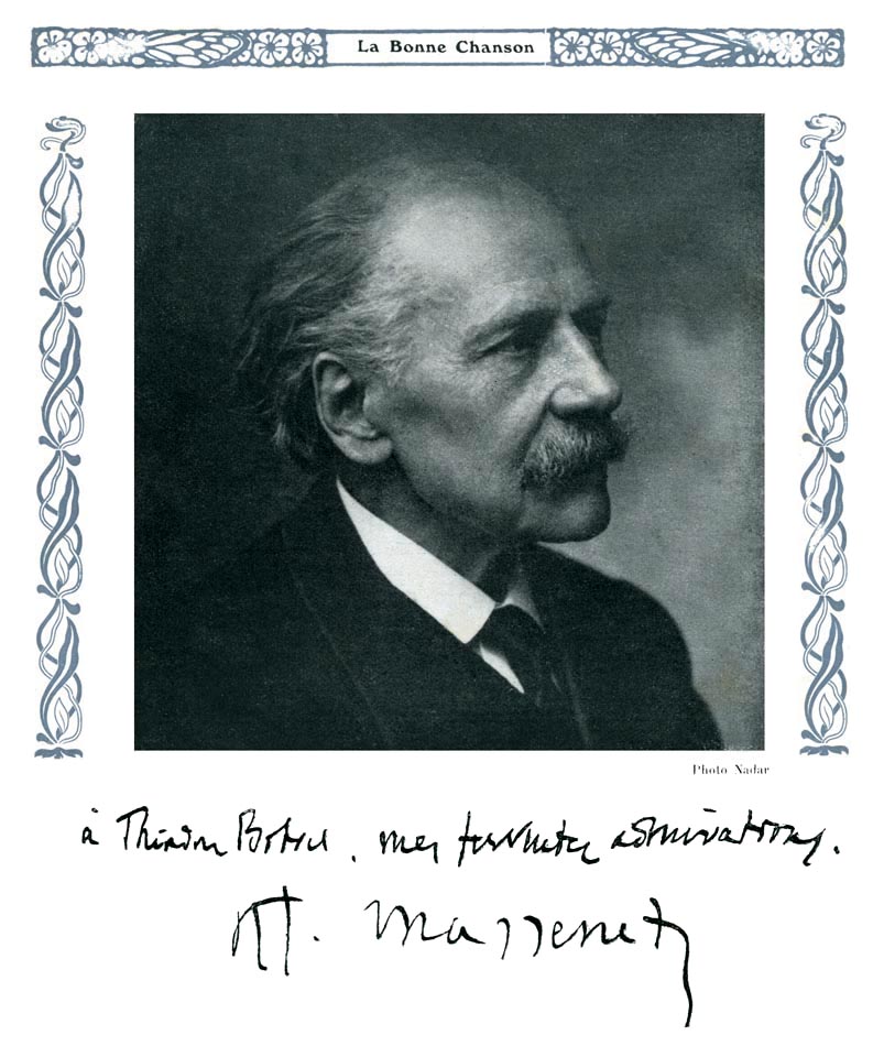 Au lendemain de la fondation de La Bonne Chanson, Théodore Botrel recevait de Massenet une lettre d'encouragement et de félicitations dont nous reproduisons ci-dessus la dernière formule. Le grand musicien dont la mort prématurée laisse tant de regrets, a été un compositeur aimé et apprécié du grand public. Il a su amalgamer des tendances diverses et parfois contradictoires. « Massenet, dit Jean Chantavoine, avait débuté comme compositeur de théâtre à la fin du régime meyerbeerien, assoupli et détendu par Gounod. Il a commencé par adopter, sans chercher plus loin, cette forme d'art : à Meyerbeer il a pris l'appareil pompeux, chez Gounod l'exemple de la tendresse et de la grâce qu'il a faite seulement plus sensuelle, par la force de sa nature. » Massenet a été le champion de la musique claire, facile, compréhensible pour tous. Il n'a jamais écrit pour un groupe fermé d'amateurs et son beau talent s'est librement épanoui en des œuvres exquises que tout le monde connaît. (la Bonne Chanson n° 60, octobre 1912)