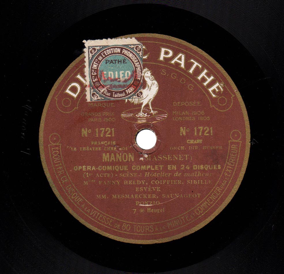 Scène "Hôtelier de malheur" extrait de l'acte I de Manon de Massenet Fanny Heldy (Manon), Marthe Coiffier (Poussette), Madeleine Sibille (Javotte), Lucienne Estève (Rosette), Georges Mesmaecker (Guillot de Morfontaine), Maurice Sauvageot (De Brétigny), Léon Ponzio (Lescaut), Chœurs et Orchestre de l'Opéra-Comique dir Henri Büsser Pathé saphir 80 tours n° 1721, mat. 7, enr. en février 1923 [extrait de l'intégrale de Manon]