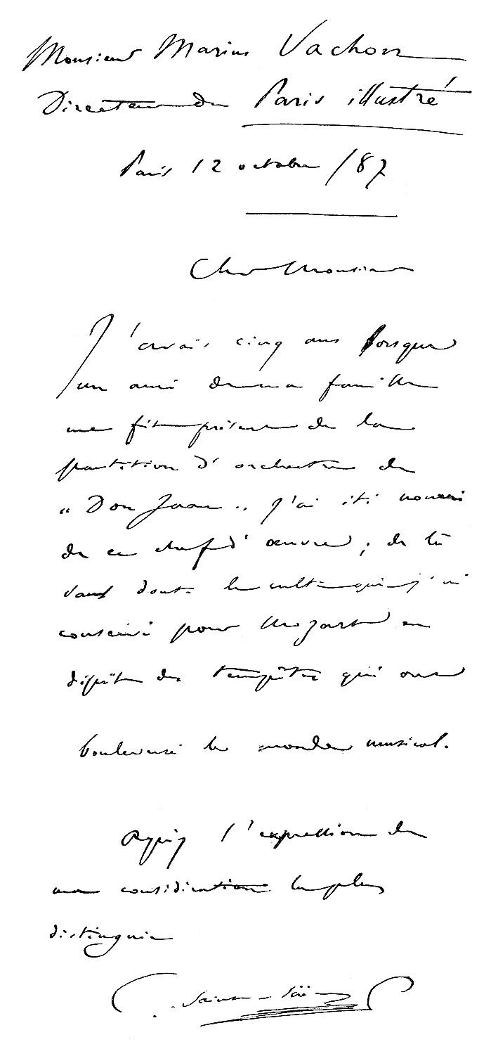 "Le Paris illustré a eu l'idée de demander aux maîtres de l'école française de musique, leur appréciation sur Mozart et sur l'oeuvre immortelle [Don Juan] dont l'Opéra va célébrer, le 25 octobre, le centenaire." (Paris illustré, 22 octobre 1887)