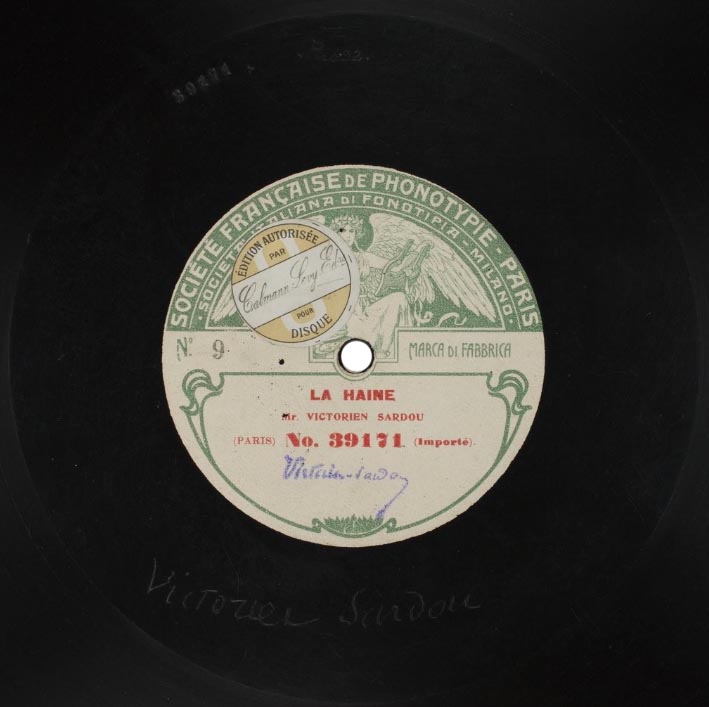 Victorien Sardou a « dit » les trois disques suivants (27 cm. 12fr.50) : fragments de : 39.091 : Patrie ! 39.207 : la Famille Benoîton 39.171 : la Haine dont il est l’auteur.
