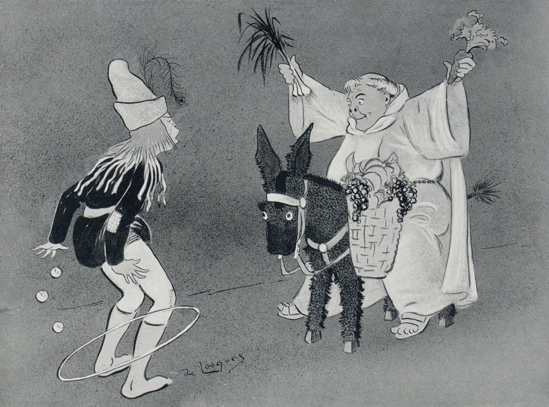 Et maintenant, voulez-vous tours de jonglerie, Voire de sorcellerie ? Faut-il dans les airs brûlants, Évoquer griffons et diables volants ? (S'arrêtant, honteux de ce sacrilège ; à la Vierge.) Pardon, l'habitude ! (Se rapprochant de la Vierge, et en confidence.) Entre nous, j'exagère ! Mais vous savez qu'un boniment N'est jamais absolument Sincère. (Reprenant.) Attention ! pour finir la séance, J'aurai l'honneur de danser devant vous (Avec humilité.) Tout simplement la danse de chez nous.