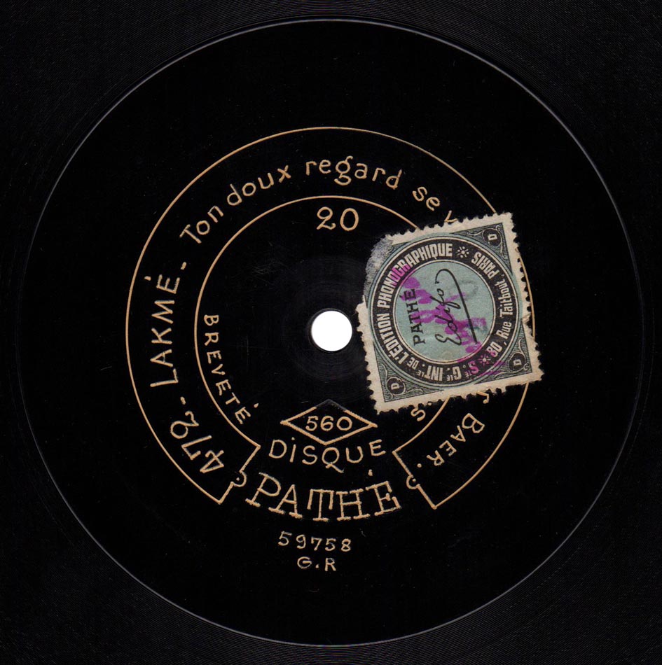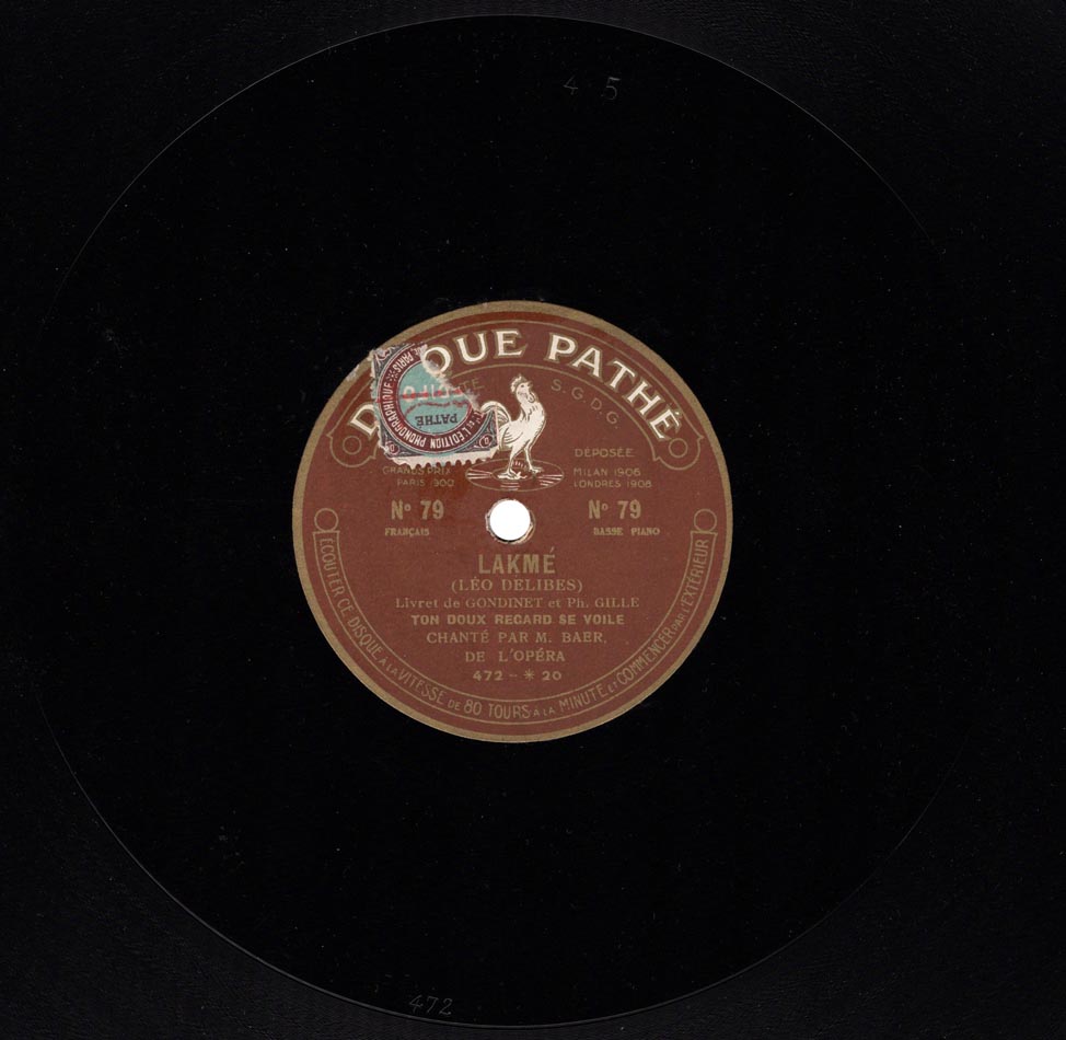 Stances "Lakmé, ton doux regard se voile" extrait de l'acte II de Lakmé de Delibes Fernand Baër (Nilakantha) et Piano Pathé saphir 90 tours n° 472, réédité sur 80 tours n° 79, enr. en 1904