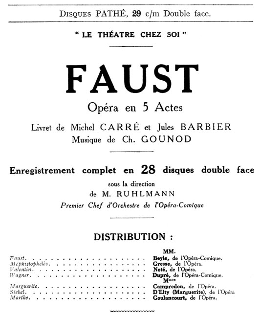 Air des Bijoux extrait de l'intégrale de Faust de Gounod de 1912 Jeanne Campredon (Marguerite) et Orchestre de l'Opéra dir François Rühlmann Pathé saphir 90 tours mat. F.23 et F.24, réédités sur 80 tours n° 1633, enr. en 1911/1912