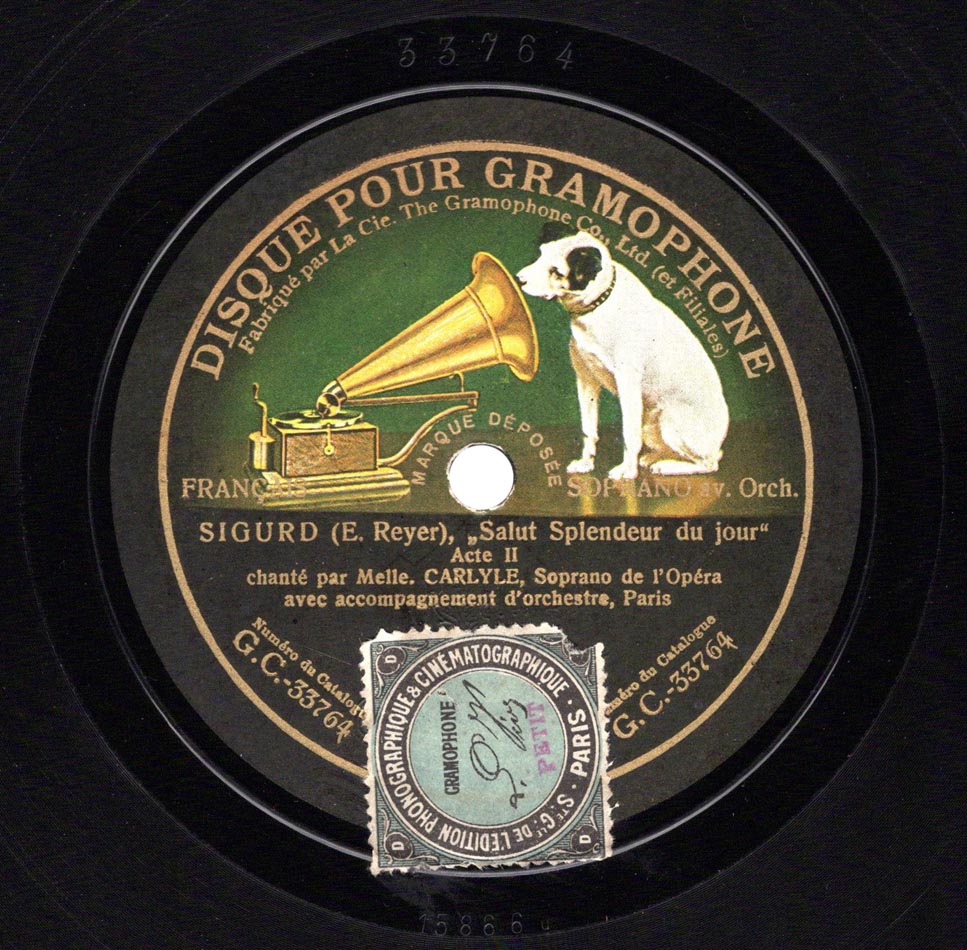 "Salut, splendeur du jour... Ô mon sauveur silencieux" extraits de l'acte III de Sigurd de Reyer Odette Carlyle (Brunehilde) et Orchestre Disque Pour Gramophone 33764, mat. 15866u, et 33791, mat. 15915u, enr à Paris les 15 et 17 juin 1910