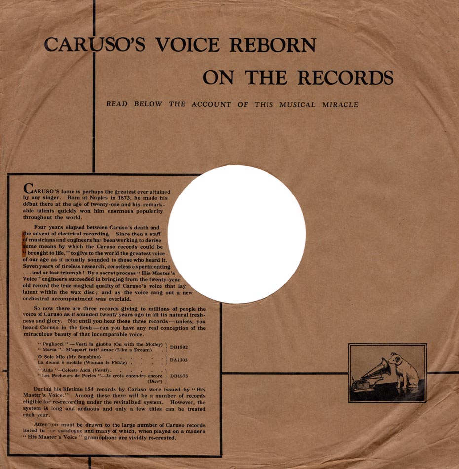 Caruso, étant mort en 1921, n'a réalisé que des enregistrements acoustiques, en chantant devant un cornet (l'enregistrement électrique par l'utilisation du microphone n'a débuté qu'en 1925).