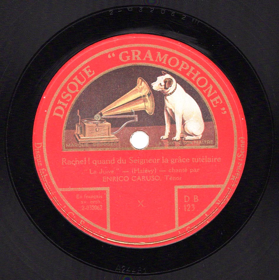 "Rachel, quand du Seigneur" extrait de l'acte IV de la Juive d'Halévy Enrico Caruso (Eléazar) et Orchestre dir Josef Pasternack Victor 88625, mat. C-24461, réédité sur Gramophone DB 123, mat. 2-032062, enr. à Camden, New Jersey, le 14 septembre 1920