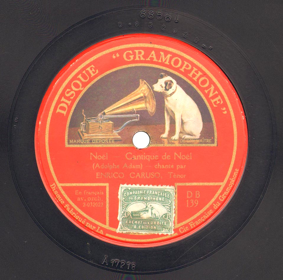 Cantique de Noël "Minuit, Chrétiens" (par. Placide Cappeau de Roquemaure / mus. Adolphe Adam) Enrico Caruso et Orchestre dir. Walter B. Rogers Victor 88561, mat. C-17218, réédité sur Gramophone DB 139, mat. 2-32022, enr. à Camden, New Jersey, le 23 février 1916