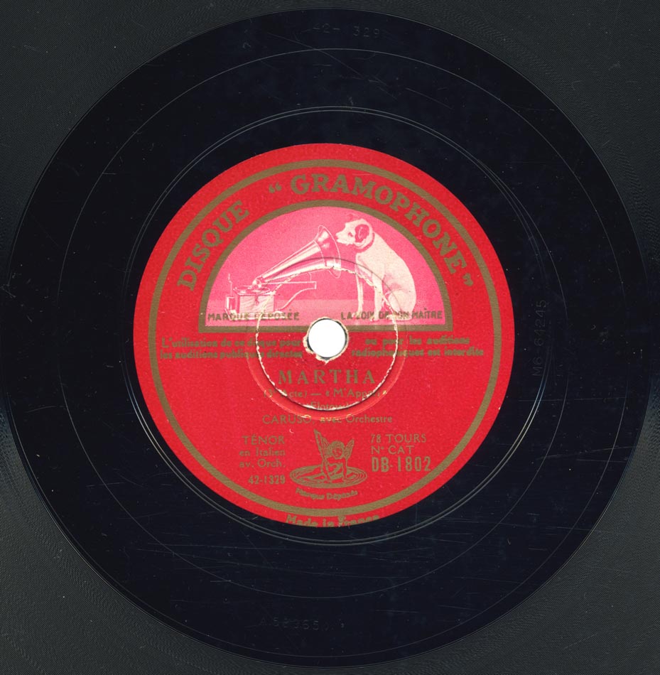"M'appari tutt' amor" extrait de l'acte III de Martha de Flotow Enrico Caruso (Lionel) et Orchestre dir. Josef Pasternack Victor 88001, mat. C-3100, enr. à New York le 15 avril 1917 (a) réenregistré à Camden, New Jersey, le 15 août 1932 avec le Victor Symphony Orchestra dirigé par Nathaniel Shilkret sur Gramophone DB 1802, mat. 42 1329 (b)
