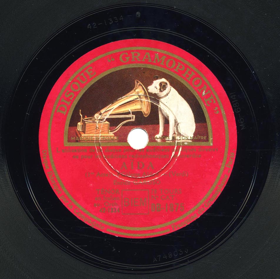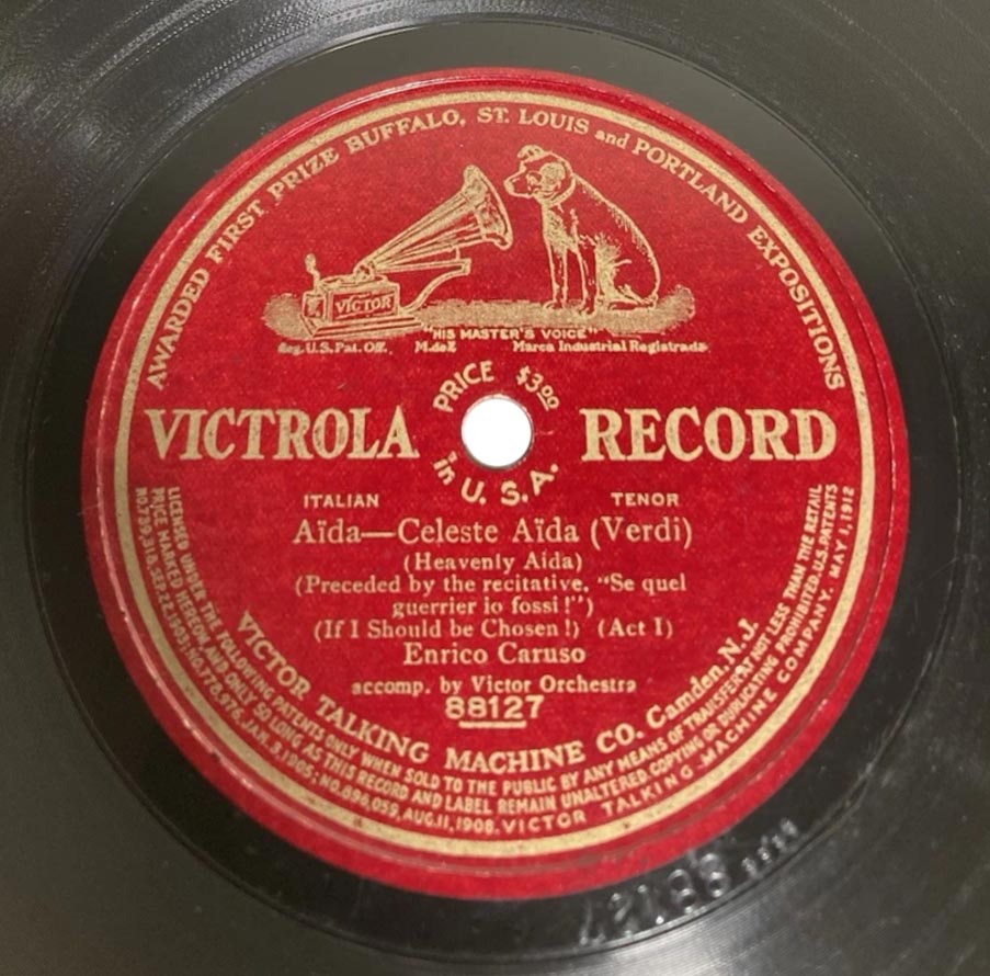 "Celeste Aida" extrait de l'acte I d'Aida de Verdi Enrico Caruso (Radamès) et Victor Orchestra Victor 88127, mat. C-3180, enr. à Camden, New Jersey, le 29 mars 1908 (a) réenregistré à Camden le 03 décembre 1932 avec le Victor Symphony Orchestra dirigé par Nathaniel Shilkret sur Gramophone DB 1875, mat. 42 1334 (b)