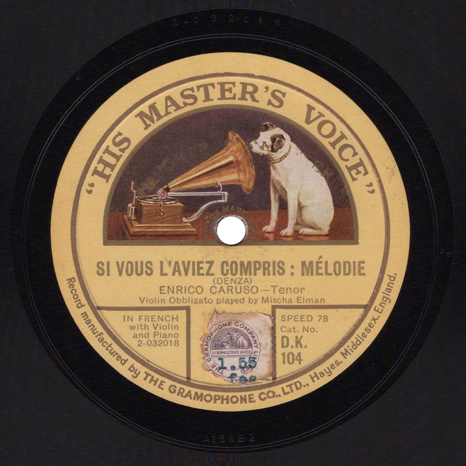 Si vous l'aviez compris (par. Stéphan Bordèse / mus. Luigi Denza) Enrico Caruso, Mischa Elman (violon) et Gaetano Scognamiglio (piano) Victor 89084, mat. C-15682, réédité sur Disque Pour Gramophone 2-032018 et DK 104, enr. à New York le 06 février 1915